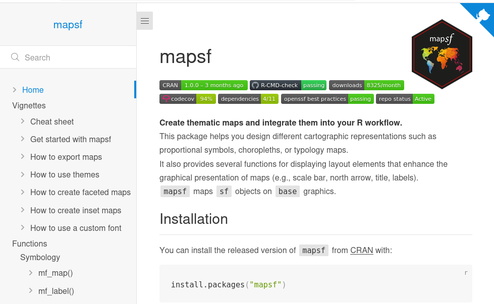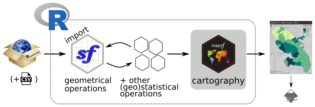 Dans ce document, nous utiliserons principalement le package mapsf dont les fonctionnalités sont assez complètes et la prise en main plutôt simple. De plus, le package est relativement léger.
