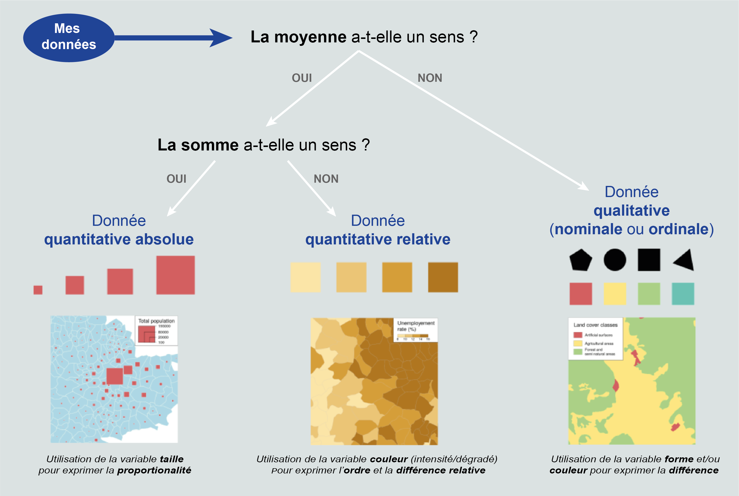 Pour une première approche de la cartographie thématique on peut se référer à la figure suivante qui résume de manière simplifiée la relation entre un type de variable et sa représentation graphique correcte.