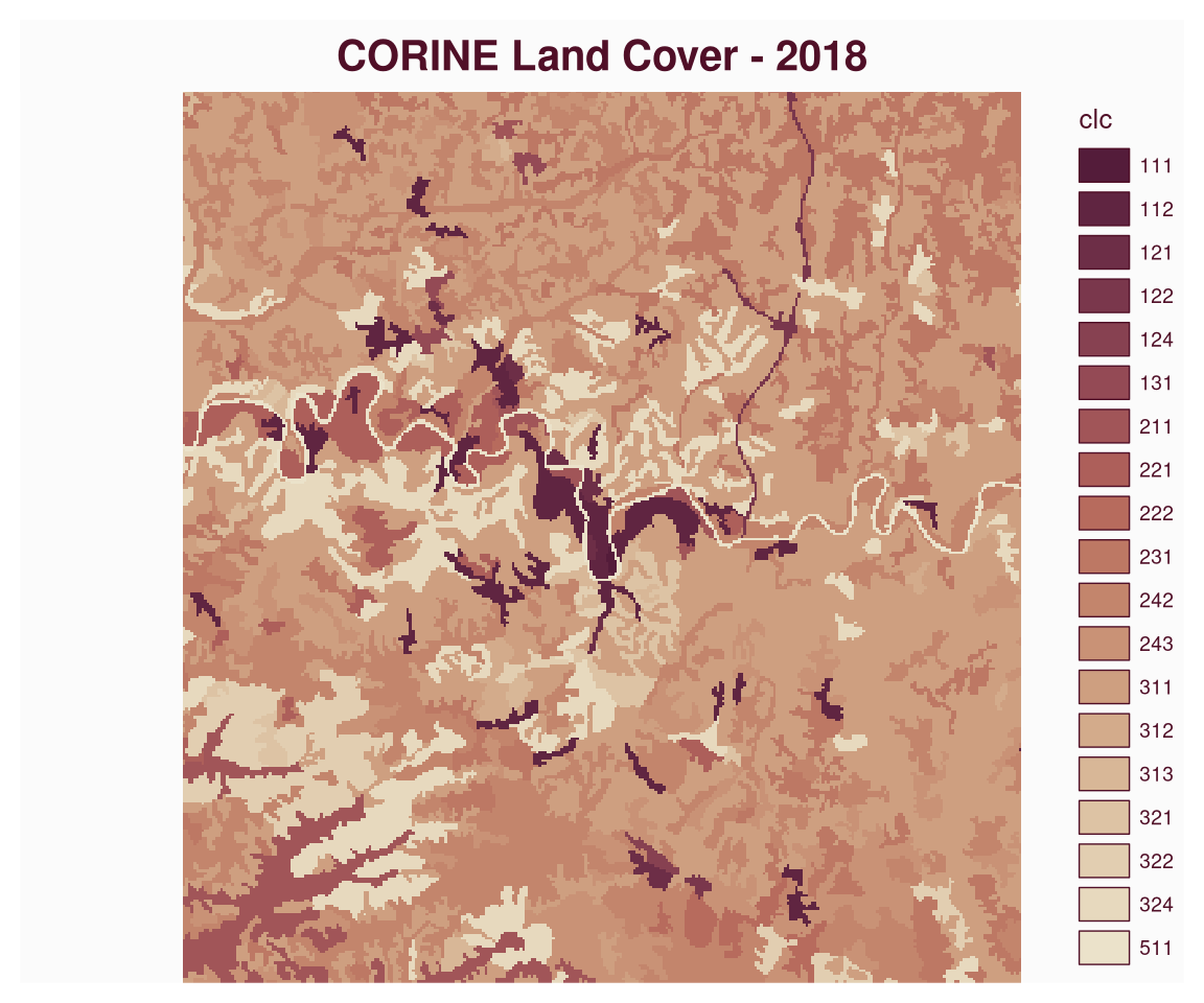 clc <-rast("data/clc_2018.tif")mf_raster(clc, type ="classes")mf_title("CORINE Land Cover - 2018")