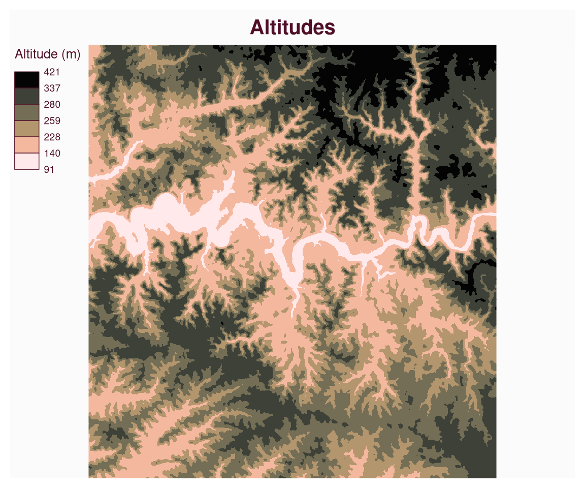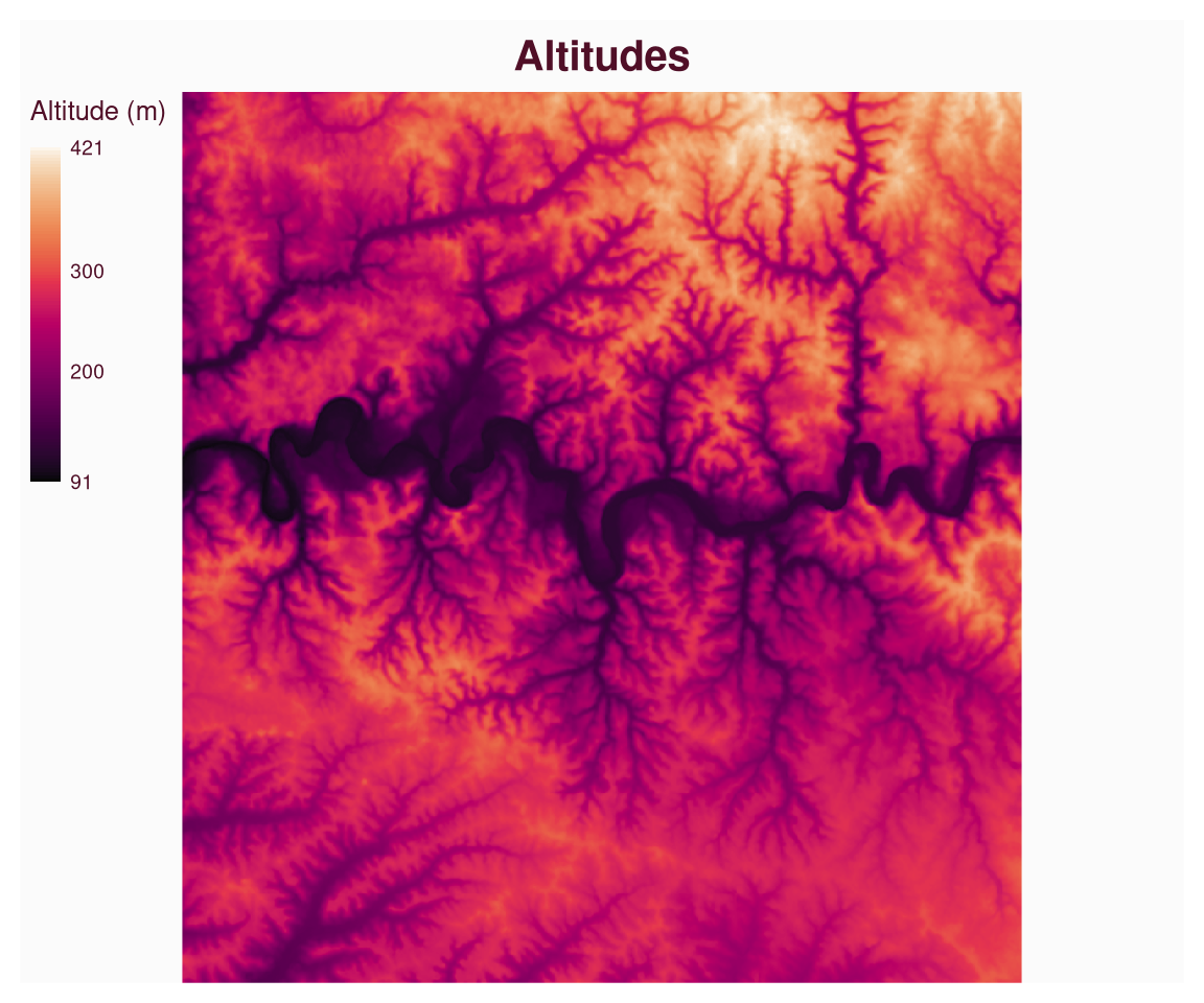 Cependant, la fonction mf_raster() permet trois types de cartes s’appuyant sur des données raster, des objets terra. Les cartes raster bénéficient de tous les éléments de mise en page (titre, échelle, flèche nord, graticules…) et peuvent être combinées avec des objets vectoriels.