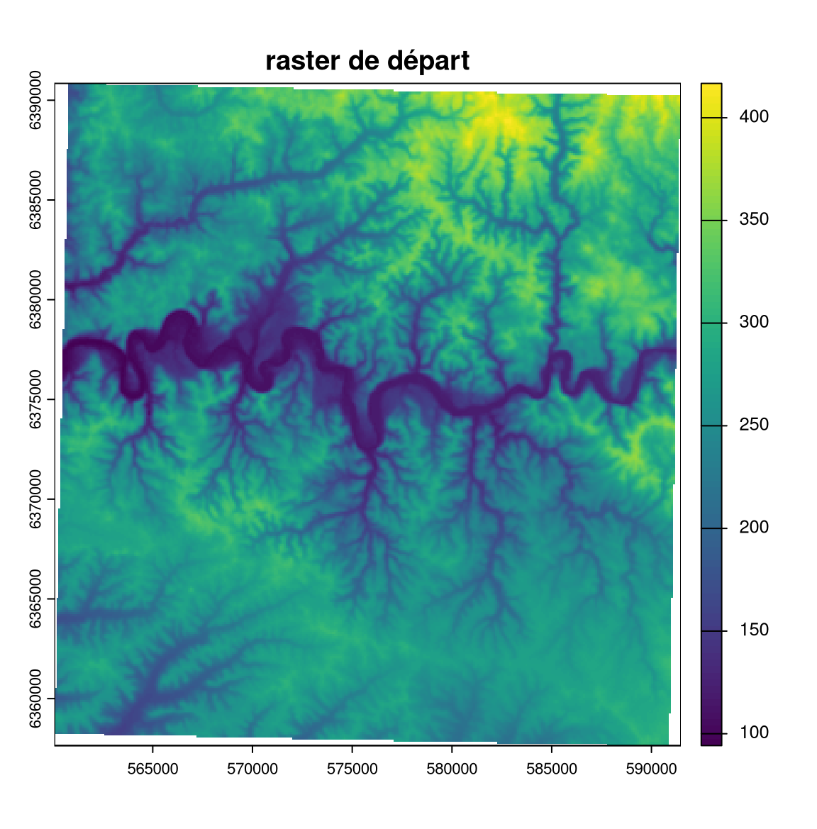 elev_focal_mean <- focal(elev, w = mon_focal, fun = mean)plot(elev, main = "raster de départ")