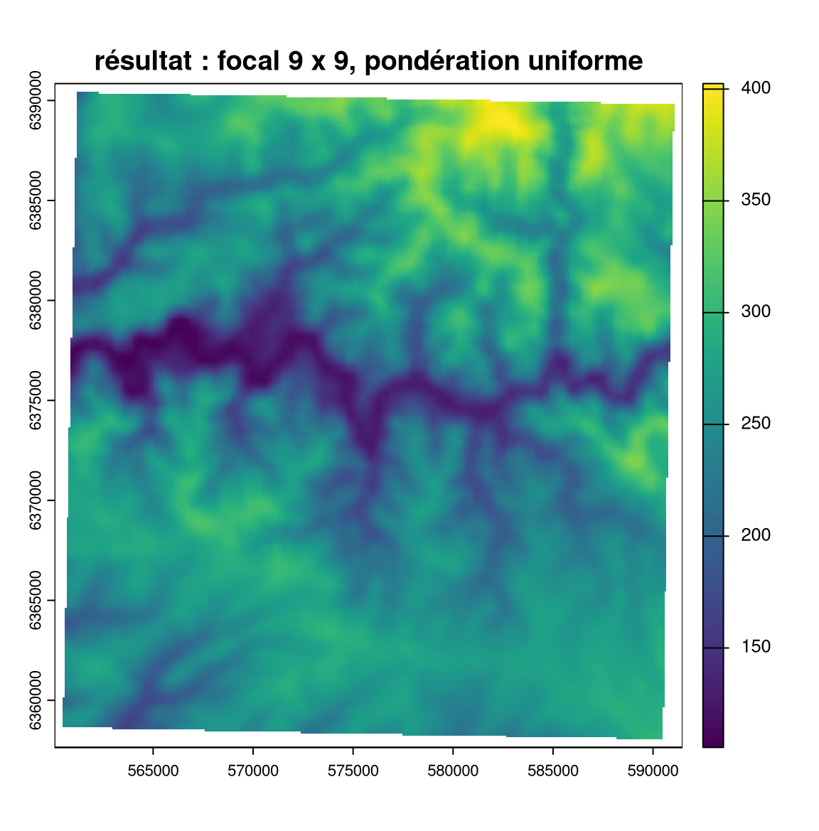 plot(elev_focal_mean, main="résultat : focal 9 x 9, pondération uniforme")