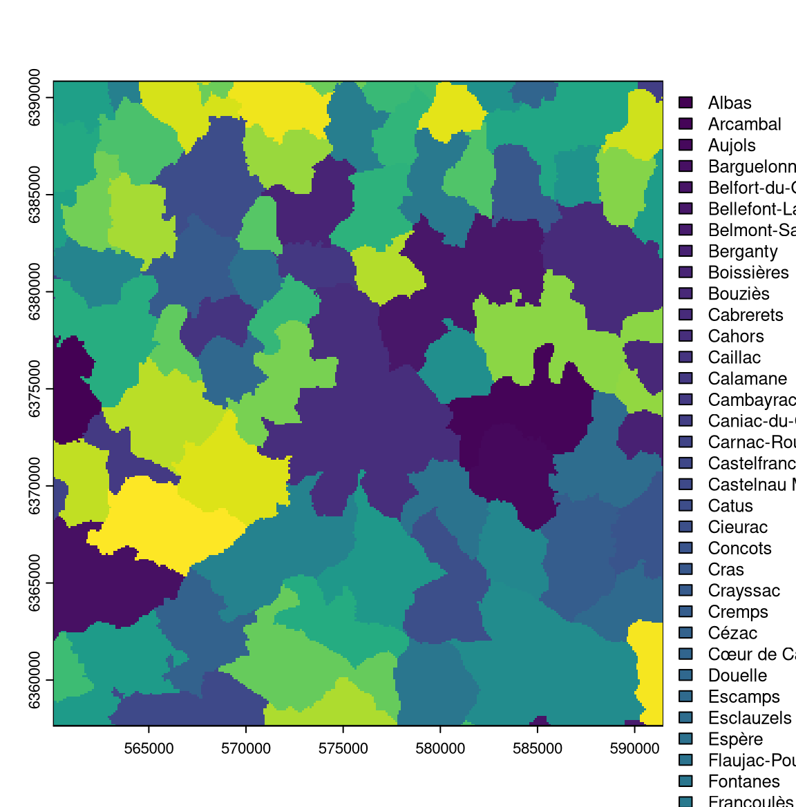 raster_commune <- rasterize(x = commune, y = elev , field = "NOM_COM")