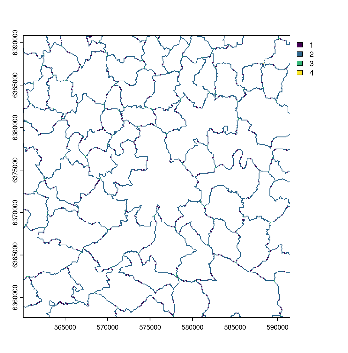 raster_com_line <- rasterize(x = as.lines(commune), y = elev, fun=sum)