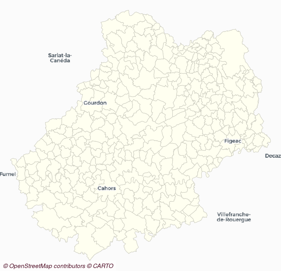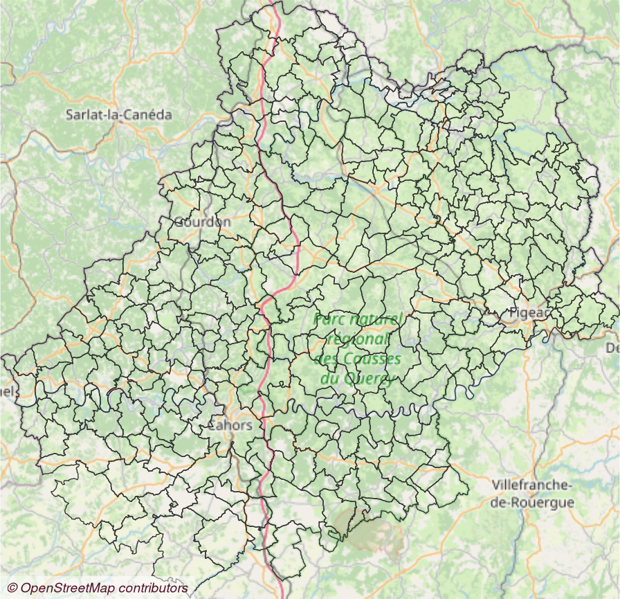 library(sf)library(maptiles)library(mapsf)com_raw <-st_read("data/lot.gpkg", layer ="communes", quiet =TRUE)com <-st_transform(com_raw, 3857)# Récupération d'un fond de carte OSMosm_tiles <-get_tiles(x = com, zoom =9, crop =TRUE)mf_theme(mar =c(0,0,0,0))mf_raster(osm_tiles)mf_map(com, border ="grey20", col =NA, lwd = .7, add =TRUE)mf_credits(get_credit("OpenStreetMap"), bg ="#ffffff80")